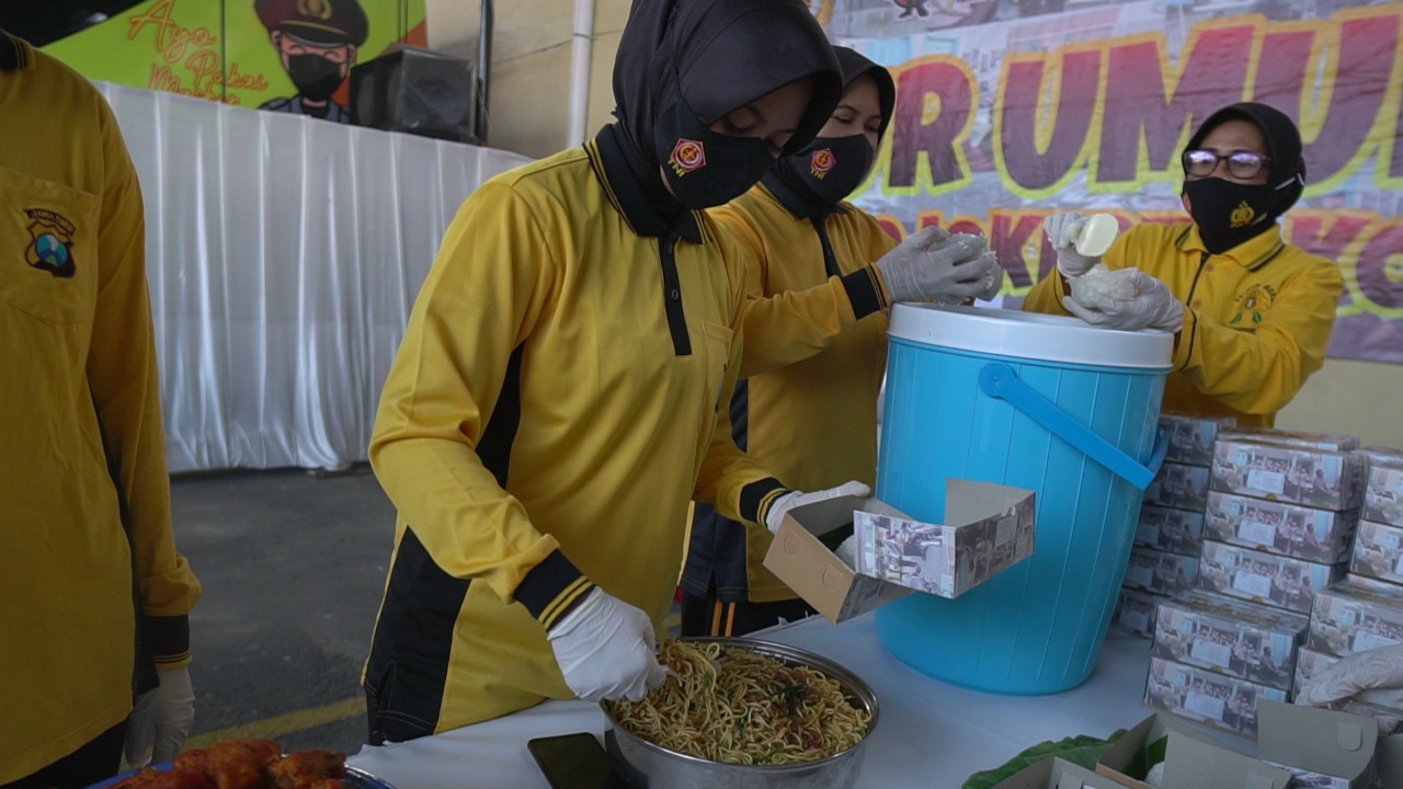 Polwan Polresta Mojokerto memasak nasi, mie dan telur kegiatan di dapur umum ini bakal dibagikan pada Pasien dan Tenaga Kesehatan (Nakes) yang berada di tempat isolasi Terpadu Gedung Diklat Jalan Raya By Pass Kota Mojokerto.