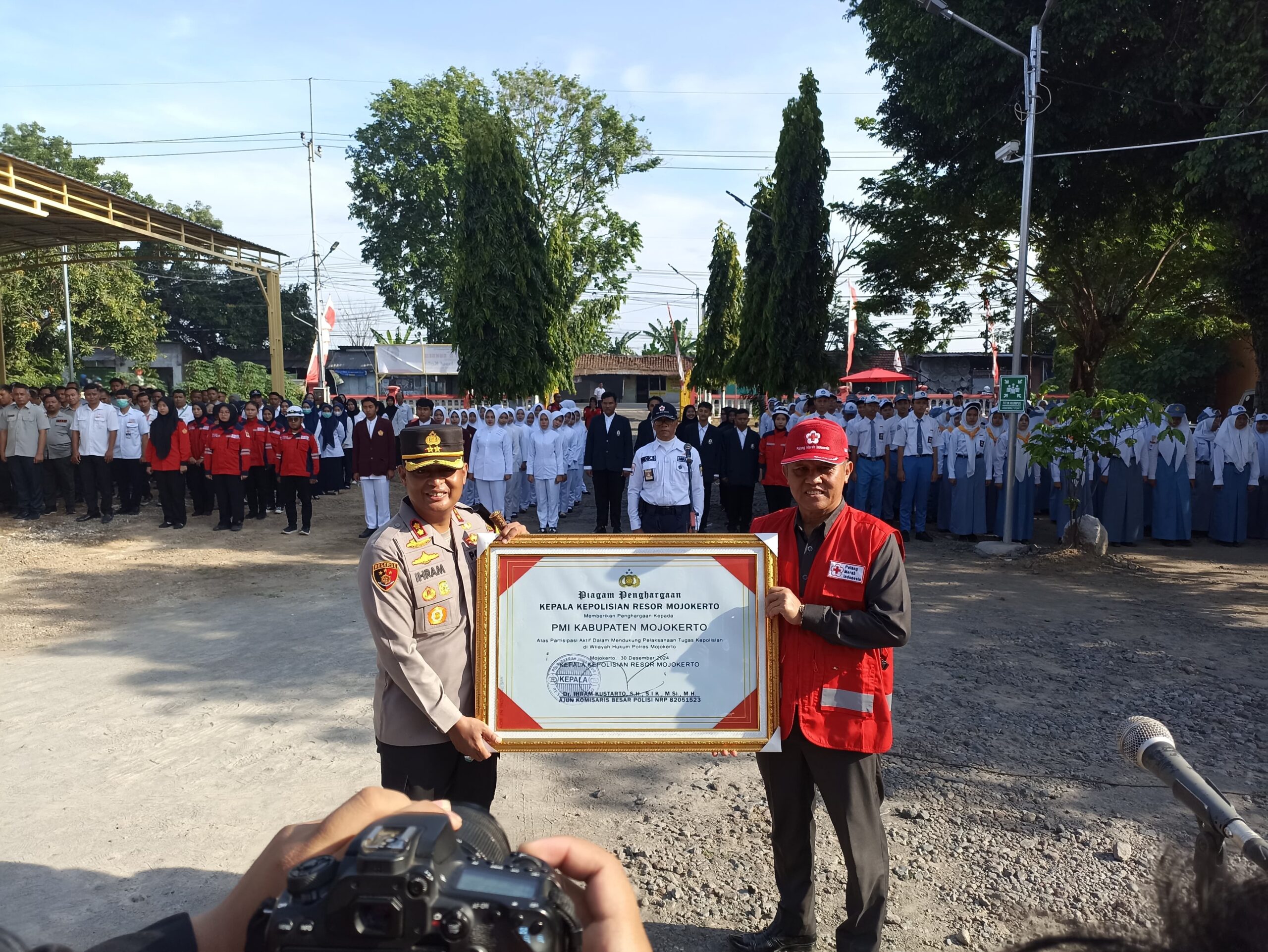Selain pelaksanaan Upacara Hari Relawan PMI yang ke – 19 tahun 2024 ini juga sekaligus penyerahan penghargaan dari Kapolres Mojokerto AKBP Ihram Kustarto dan diterima langsung oleh Ketua PMI Kabupaten Mojokerto Teguh Gunarko (AL)
