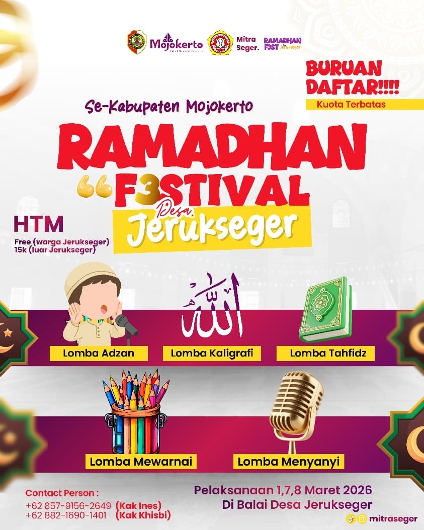 Mojokerto//jatimbangkit.com – Menuju Bulan Suci Ramadan tahun 2026 atau 1447 H Karang Taruna Mitra Seger Desa Jerukseger, Kecamatan Gedeg, Kabupaten Mojokerto kembali menggelar Ramadan Festival Vol. 3, Kegiatan tahunan ini resmi dimulai pada 1 Maret 2026 yang akan berlangsung selama tiga pekan, setiap akhir pekan, Sabtu dan Minggu.