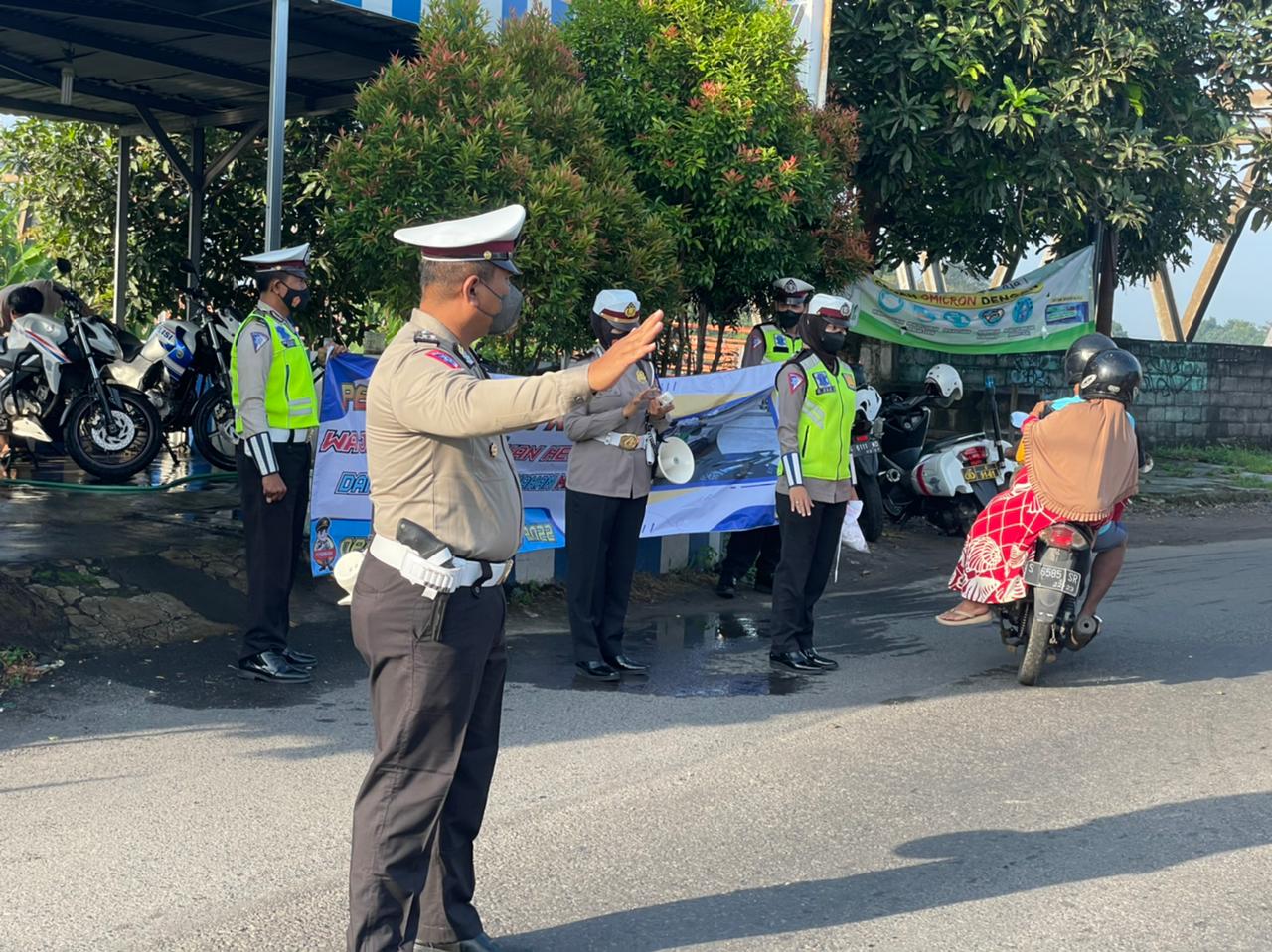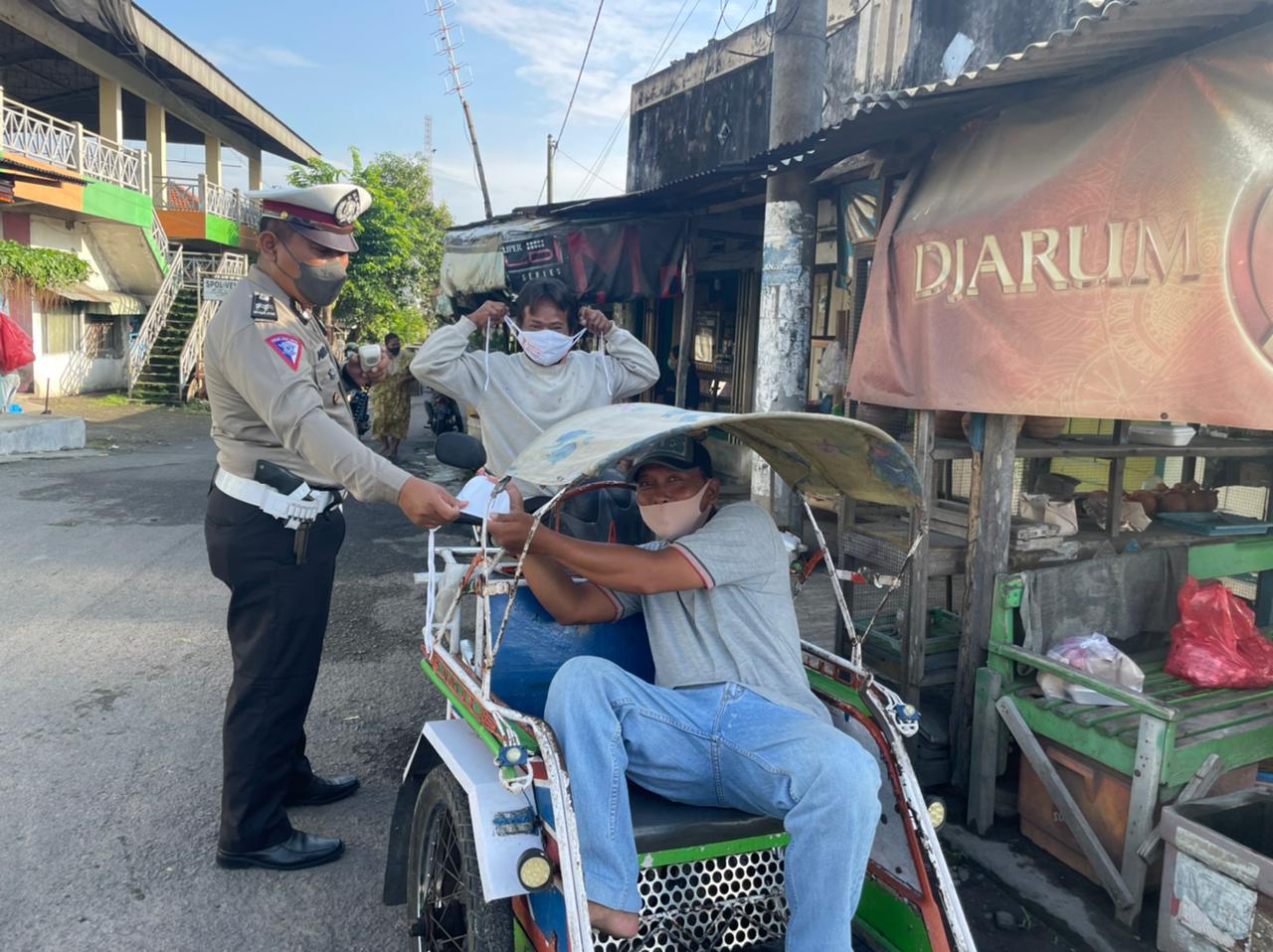 Kanit Kamsel memberikan Sosialisasi tertib berlalu lintas dan protokol kesehatan kepada masyarakat di seputaran Jalan Les Padangan untuk selalu tertib dalam berkendara serta tetap menjaga jarak serta tidak membuat kerumunan.