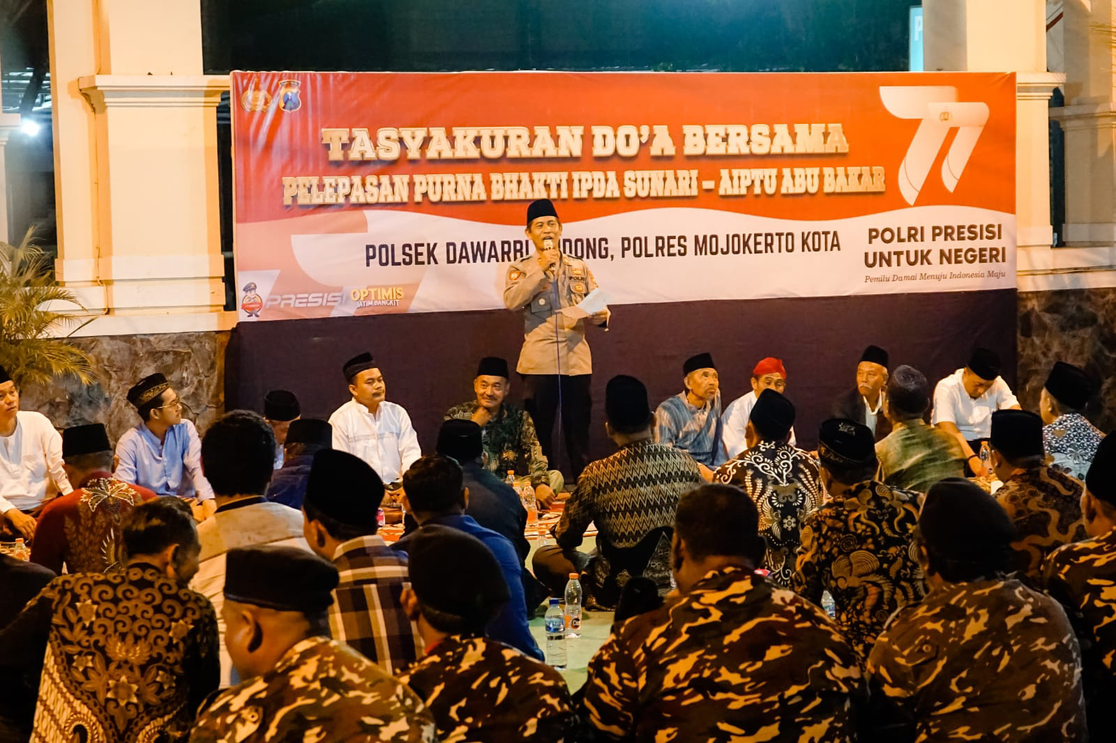 Doa bersama juga menampilkan 2 grup Al Banjari. Selain itu, Polsek Dawarblandong Polresta Mojokerto juga melepas masa purna dua anggota. ’’Kami juga melepas dua anggota yang memasuki masa purna tugas,’’ tambah AKP Agus Sugiharto.