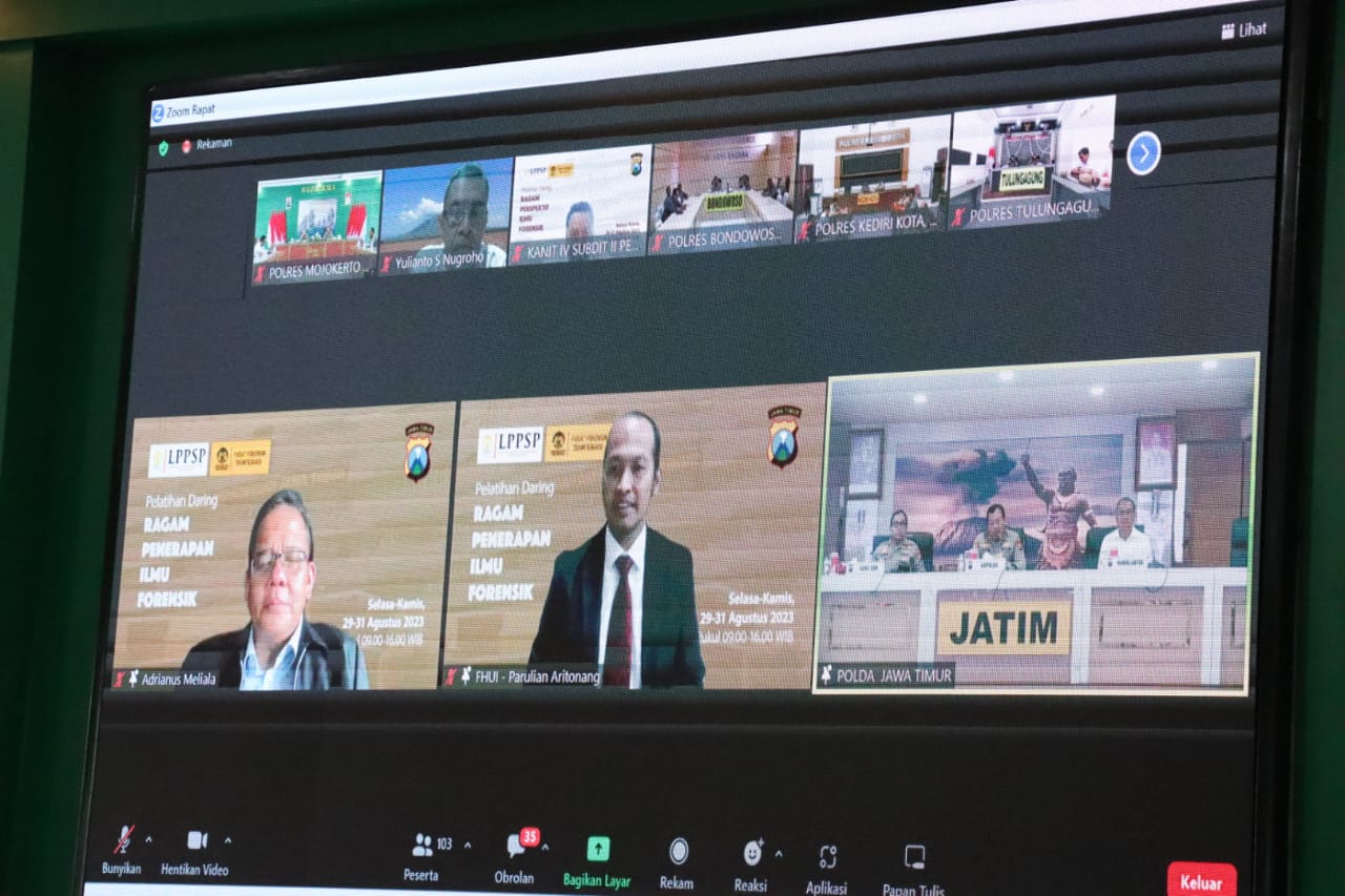 Membantu polri dalam meningkatkan pengetahuan terhadap Ilmu forensik, kegiatan kali ini dinarasumberi oleh Ketua Pusat Forensik Terintergrasi Indonesia (PFTI) Prof. Andruanus Meliala, dan juga Ketua Fakultas Hukum Universitas Indonesia (FHUI) Dr. Parulian Aritonang yang hadir sekligus berbagi pengetahuan kepada personel Polri di seluruh Jajaran Polda Jatim. (RH)