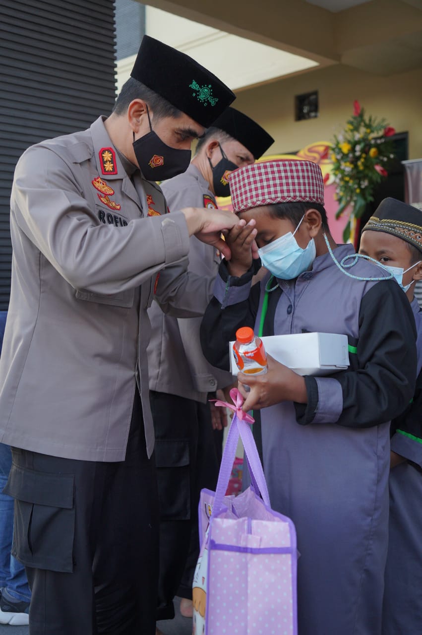 Usai acara, Kapolresta Mojokerto memberikan tanda kenangan sebuah tas yang berisi perlengkapan alat tulis dan buku serta tali asih untuk 25 anak yatim Piatu Yayasan YAMUBINA